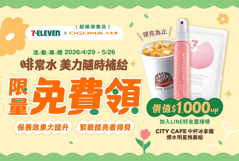 不可能吧!OGUMA水美媒攜手 7-ELEVEN 推出【限時免費兌換】活動!自 2026/4/29(三)至 5/26(二),只要你年滿16歲,在專屬活動頁登記與LINE驗證完成(每人限換一次),支付運費即可免費領取中杯CITY CAFE冰拿鐵、及價值千元的專櫃級補水保養「秘之湧天堂之泉體驗瓶84ml」1瓶與「秘之湧天堂之泉玻尿酸水面膜EX」 1片,讓你一次免費帶走咖啡及水美媒超人氣明星品項,數量有限、兌完為止。