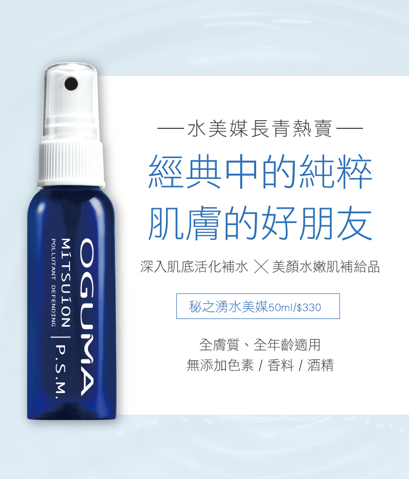 秘之湧水美媒:利用獨家礦晶離子群I.C.E.交換力量產生滲透壓,引導保養品成分深層收,讓肌膚由內而外散發自然光澤。