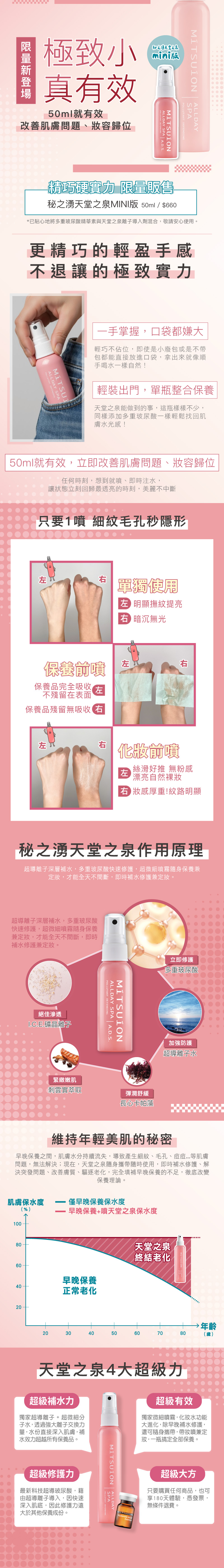 秘之湧天堂之泉:獨特的離子配方,結合保溼性極佳的玻尿酸、天然保濕因子與紅藻萃取,有效提高肌膚含水量與防護力,增加緊緻與彈性的功效,延緩老化和細紋的產生,使肌膚亮白有光澤,打造豐盈彈潤肌。