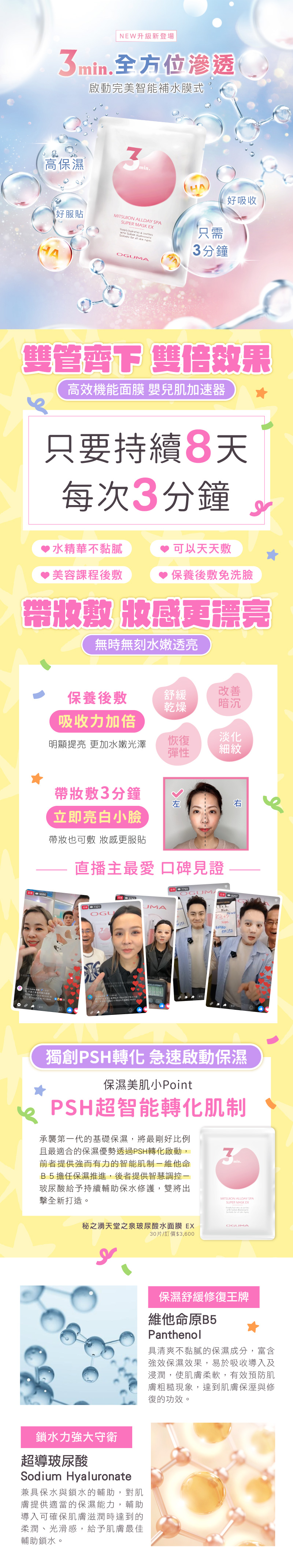 秘之湧天堂之泉玻尿酸水面膜 EX:獨家研發I.C.E.礦晶離子技術,飽含深海能量,水分吸收滋潤肌膚,密集修護保濕,舒緩肌膚不適,長時間維持水嫩透亮,隨時展現肌膚滿水位最佳狀態。