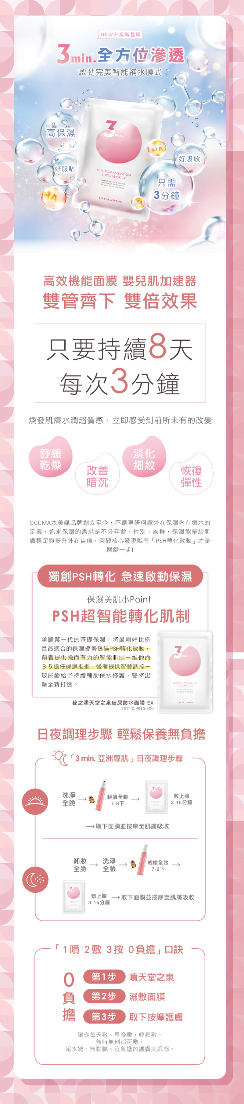 3分鐘臉就緊實看得見!蘊含高保濕導入及智能PSH轉化啟動,只要180秒迅速提升含水度,不只水潤,亮白、撫紋一把抓。