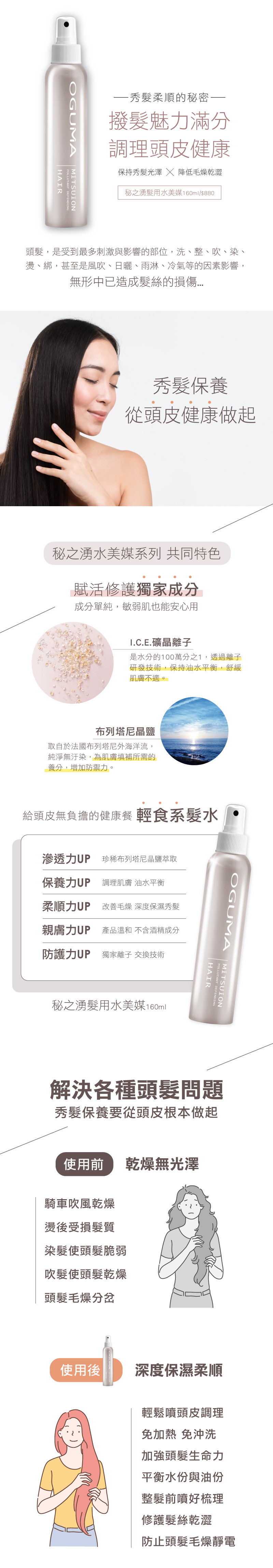 秘之湧髮用水美媒:全方位的髮用水美媒,深層保濕及柔順髮質,有效補充並平衡水份與油份,達到髮質及頭皮護理的最佳狀態。
