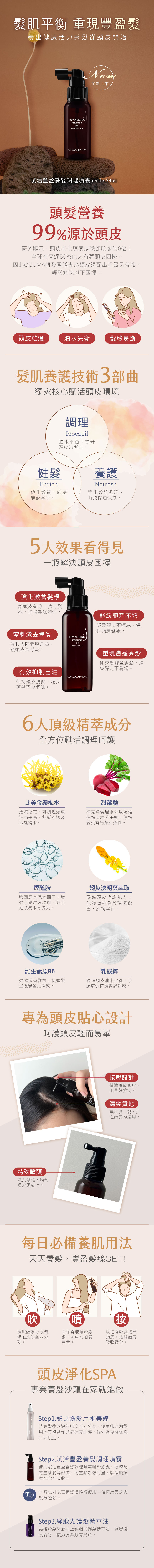 賦活豐盈養髮調理噴霧:多重植萃精華,能有效強化滋養髮根,維持頭皮健康,打造輕盈、自然蓬鬆髮感。