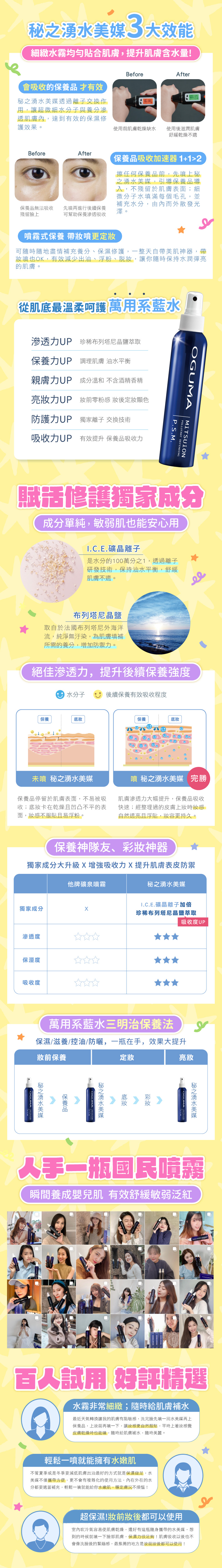 以獨特「超微細超導離子水」富含「I.C.E.礦晶離子」及珍貴「布列塔尼晶鹽」,成分單純,敏弱肌也可放心用,保養前先噴秘之湧水美媒,使保養品效果發揮到極致。