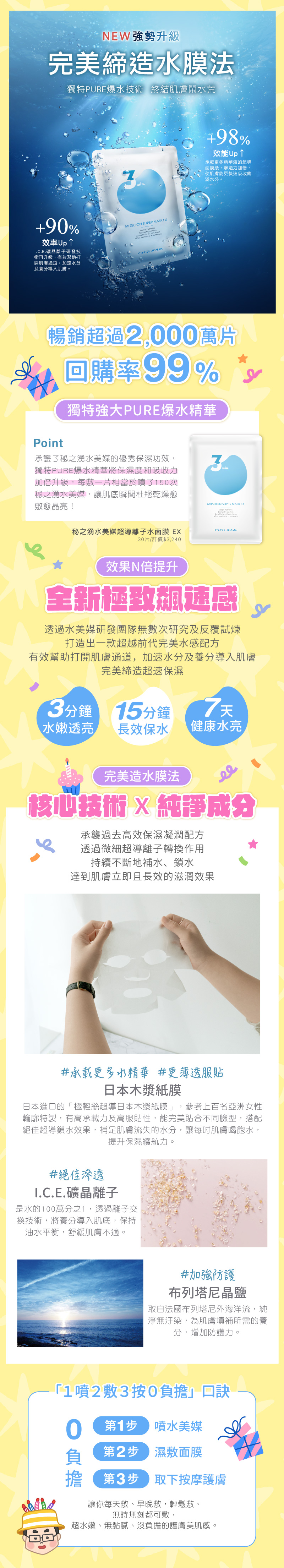 秘之湧水美媒超導離子水面膜 EX:獨家研發I.C.E.礦晶離子技術,飽含深海能量,水分吸收滋潤肌膚,密集修護保濕,舒緩肌膚不適,長時間維持水嫩透亮,隨時展現肌膚滿水位最佳狀態。