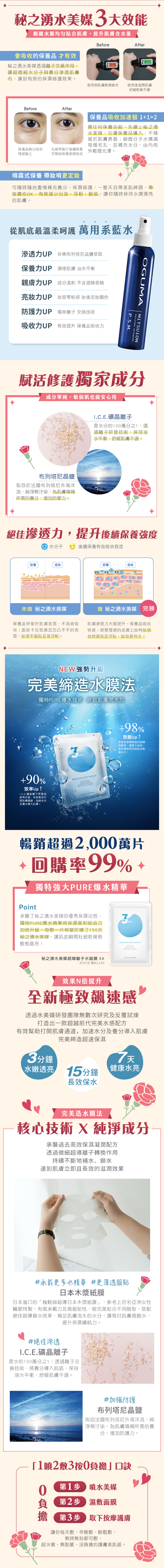 ❤︎秘之湧水美媒 礦晶離子能量加倍,添加珍貴布列塔尼晶鹽,迅速補水鎖水、啟動代謝、滋養活化,引導保養品成分深層吸收,直接補充肌膚所需水分與養分,讓肌膚由內而外散發自然光澤。 ❤秘之湧水美媒超導離子水面膜EX 獨特添加強大PURE爆水精華,3分鐘迅速緩解乾燥脫皮、15分鐘保濕更深層長效、7天後肌膚明顯水亮又健康。
